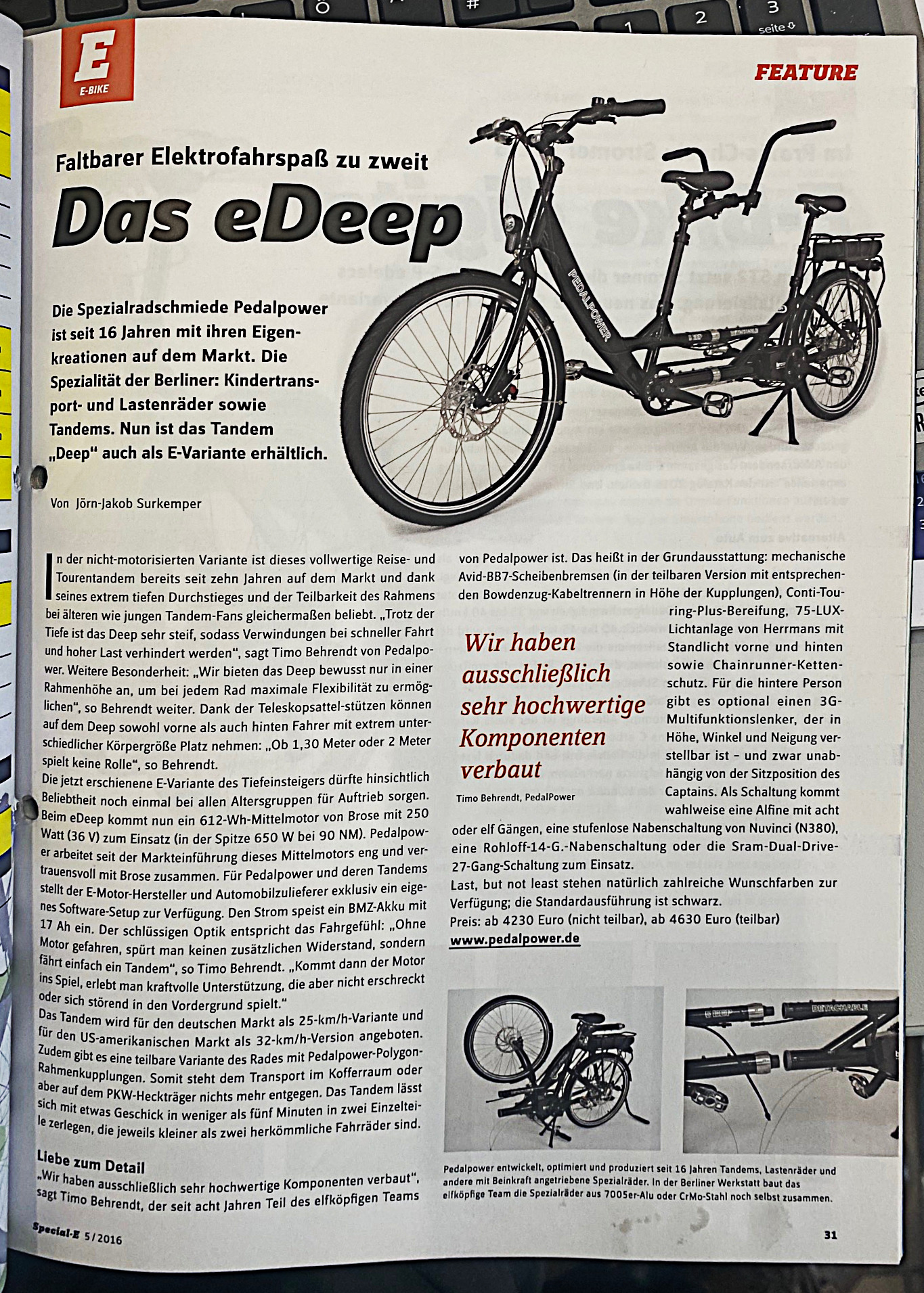 Das so bezeichnete „Tauber Tandem“ist und bleibt aber ein eDeep Detachable Pedalpower-Tandem, das bei uns in Berlin gefertigt und an diese Händler ausgeliefert wird.